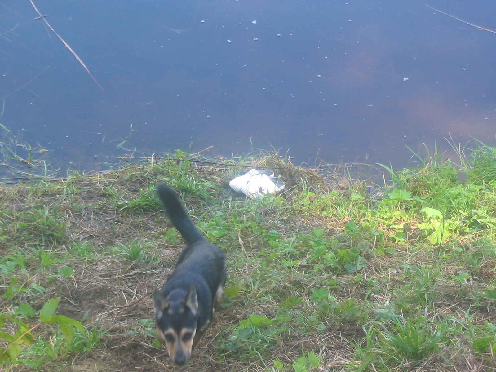 Собака лезет на берег